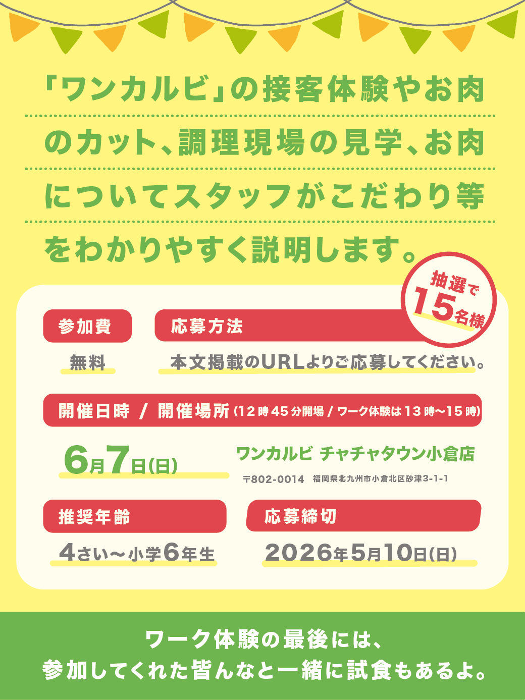 この度、6/30(火)OPEN予定のワンカルビ チャチャタウン小倉店にてこどもワーク体験の開催が決定いたしました。